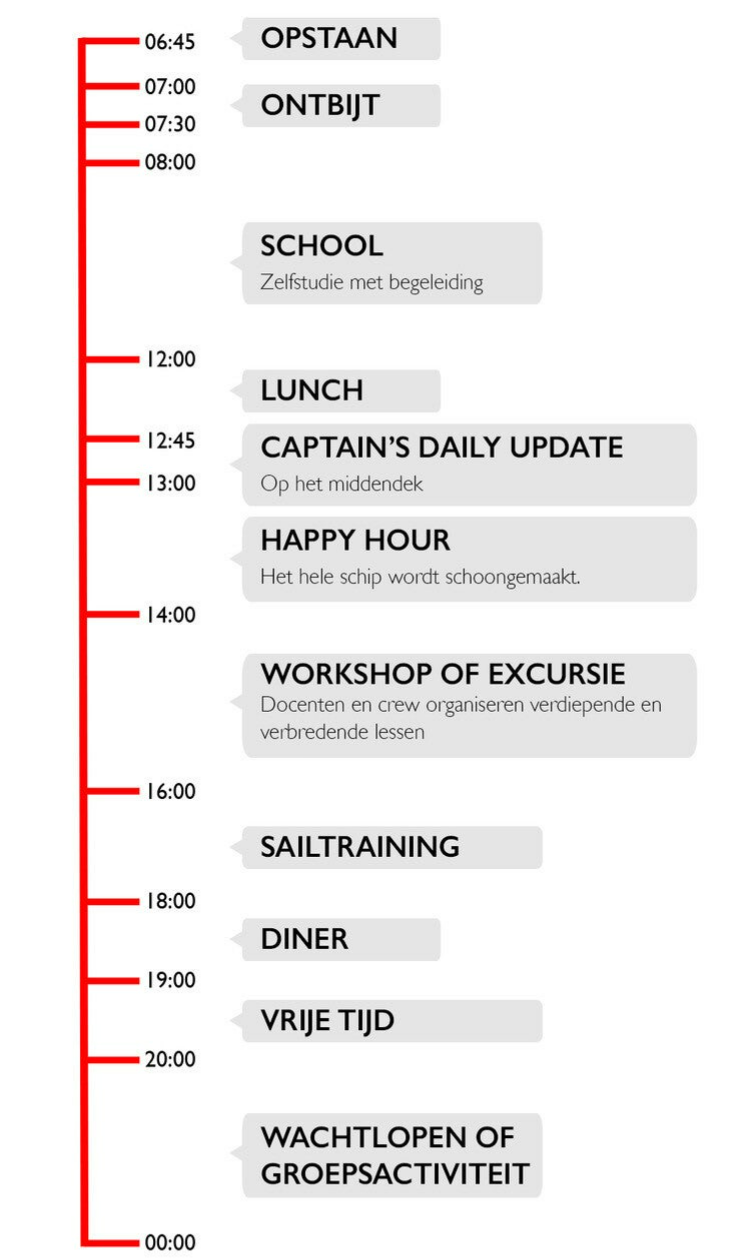 Tijdens de reis (tussen de 5 tot 7 weken) ga je aan boord gewoon naar school.